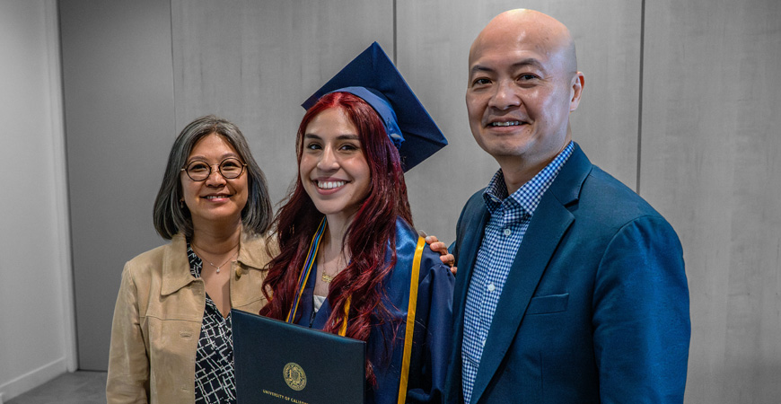 For two graduates, Jahaira Morales and Bryan Gutierrez, the ceremony also was an opportunity to meet with a couple of other individuals who have been invested in their higher-education journey at UC Merced – their scholarship benefactors, Dar Chen and Cheryl Matsubara.